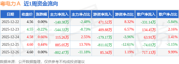 沪深股通持股方面,截止2025年12月26日收盘,粤电力A深股通持股数为580.27万股,占流通股比为23.0%。